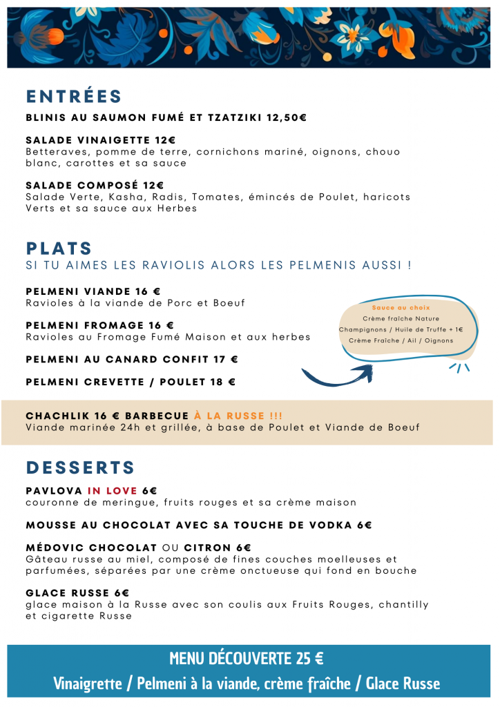 Notre menu vous invite à découvrir les saveurs authentiques des pays de l’Est, préparées avec des produits frais et de saison soigneusement sélectionnés. Nous avons à cœur de proposer des plats traditionnels, appréciés de tous, pour une expérience culinaire conviviale.